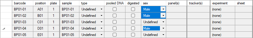 The type, options and sex fields allow you to choose one option from a predefined list. To quickly set this option for multiple samples, simply select the relevant field for all samples and press the first letter of the option you want to select. For example, setting the sex field of three samples to Male can be achieved by selecting the fields for these samples and pressing the M key.